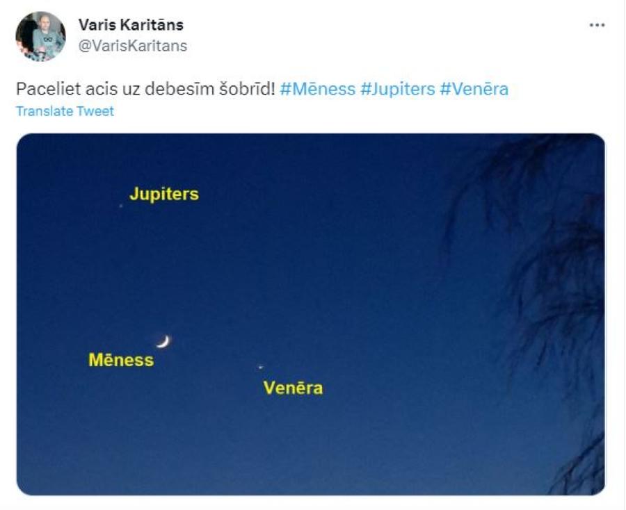 Aptuveni plkst.6:00 paskatoties debesīs, varēja redzēt mēnesi un divas planētas vienlaicīgi - Jupiteru un Venēru.
